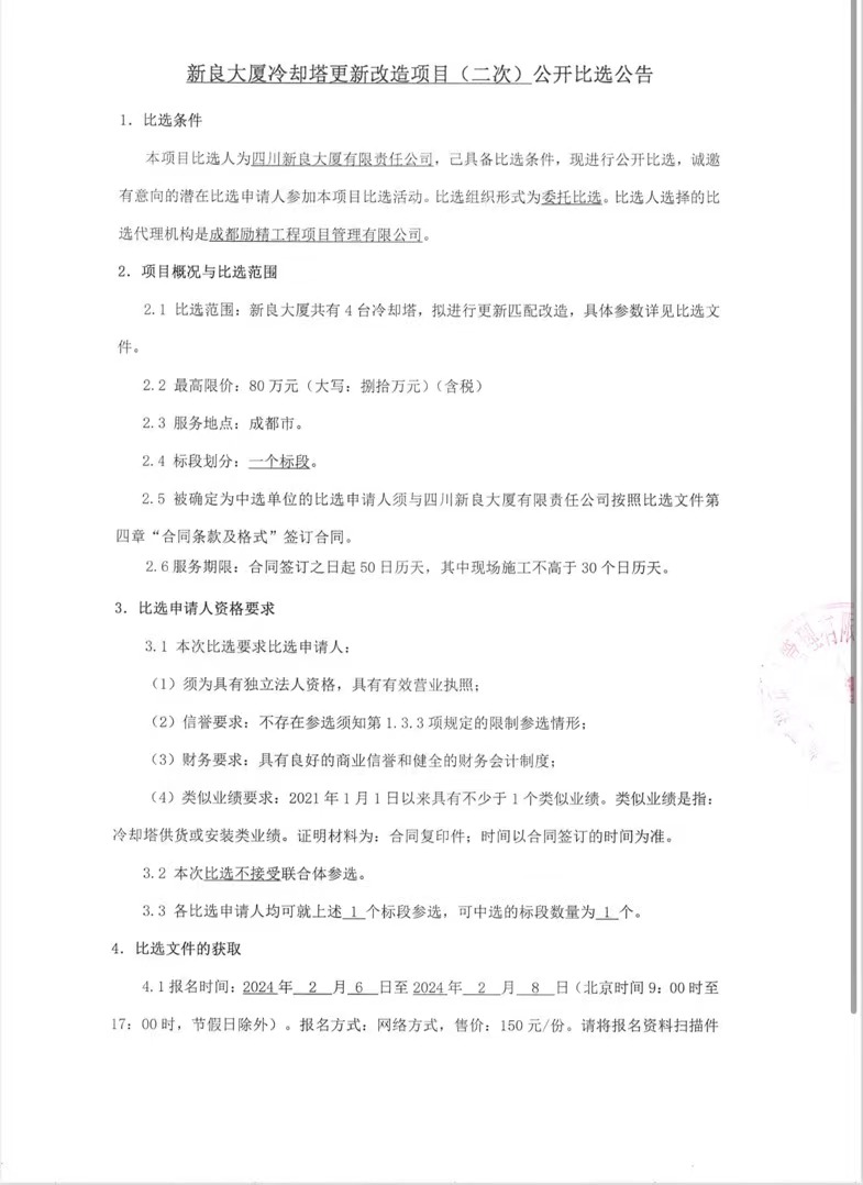 新良大厦冷却塔更新改造项目(二次)公开比选公示