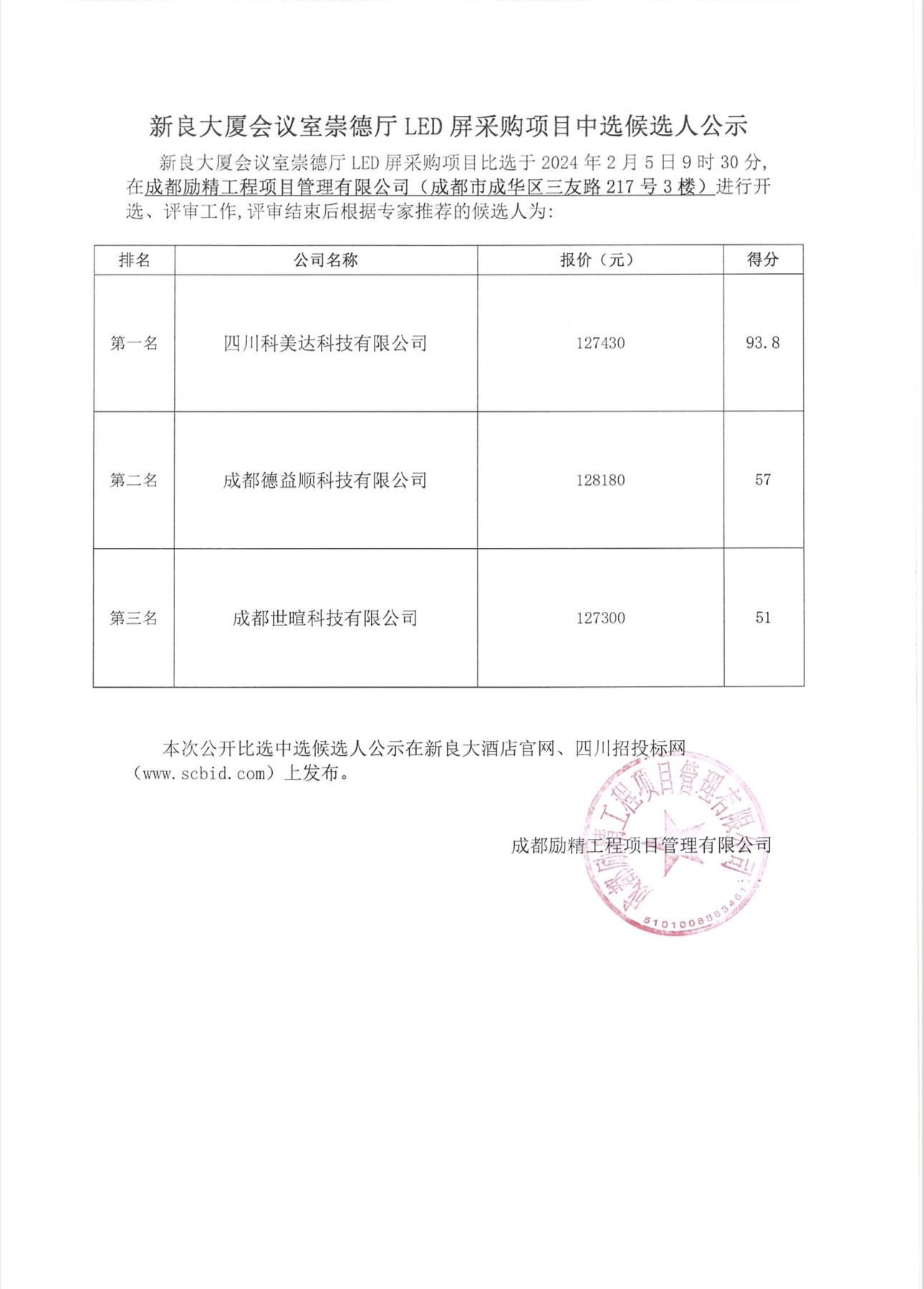 新良大厦会议室崇德厅LED屏采购项目中选候选人公示