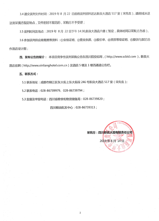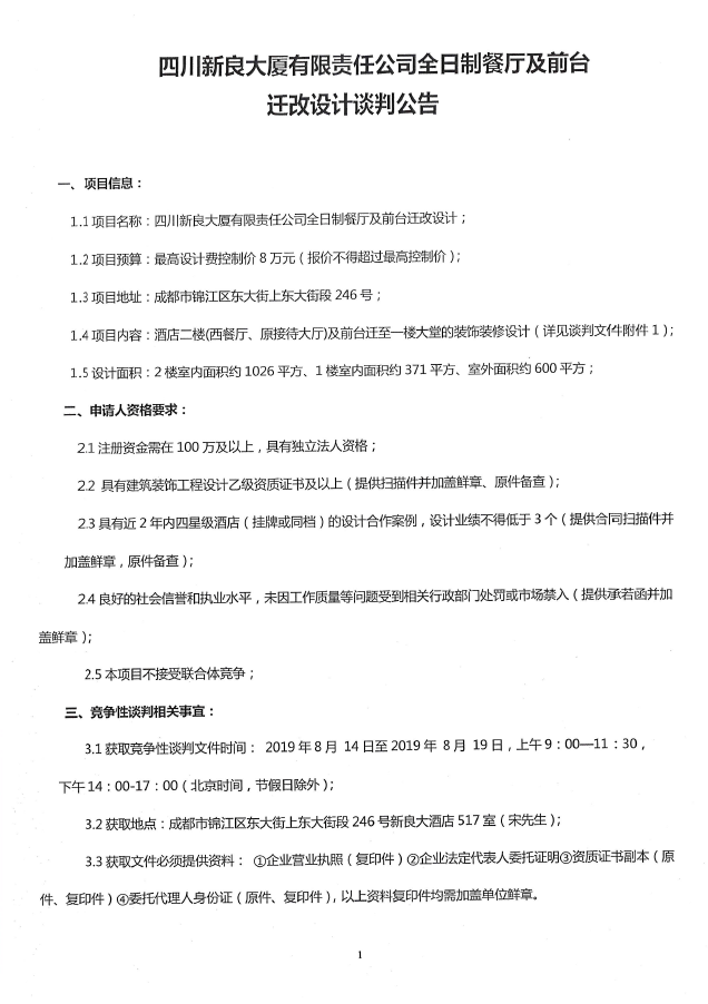 四川新良大厦有限责任公司全日制餐厅及前台迁改设计谈判公告