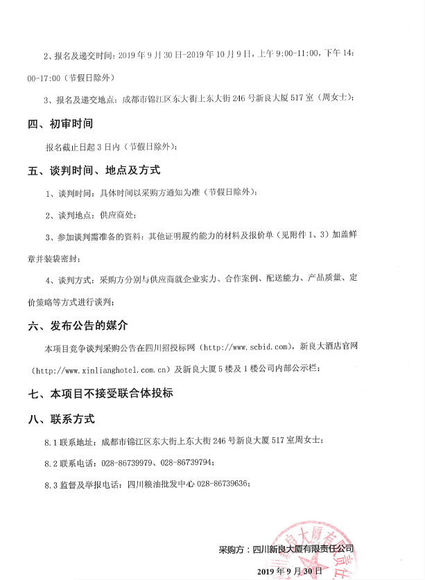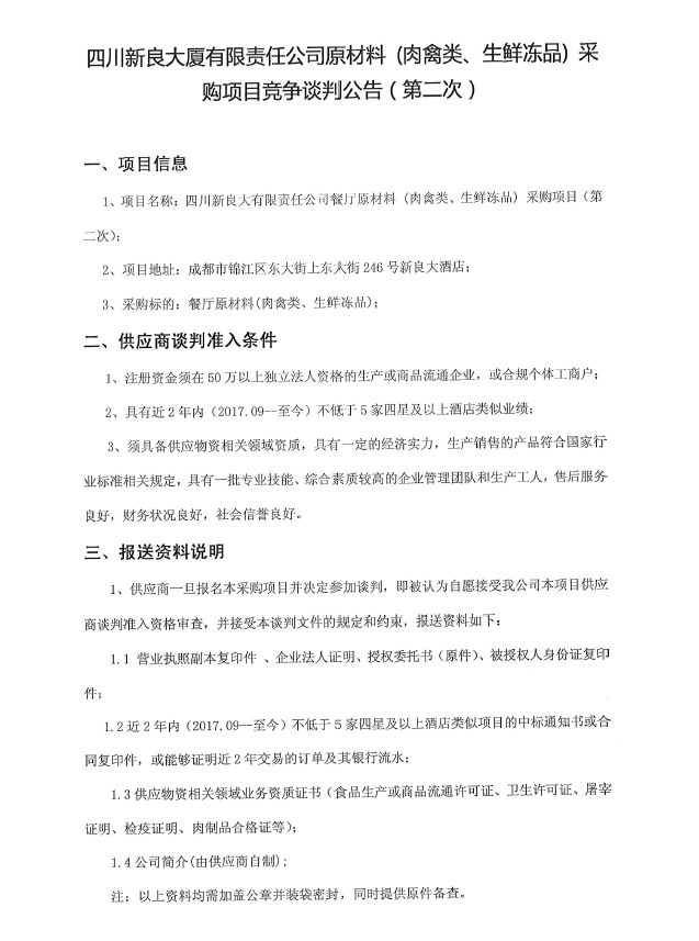 四川新良大厦有限责任公司原材料(肉禽类、生鲜冻品)采购项目竞争谈判公告(第二次)