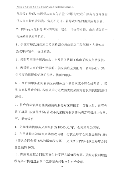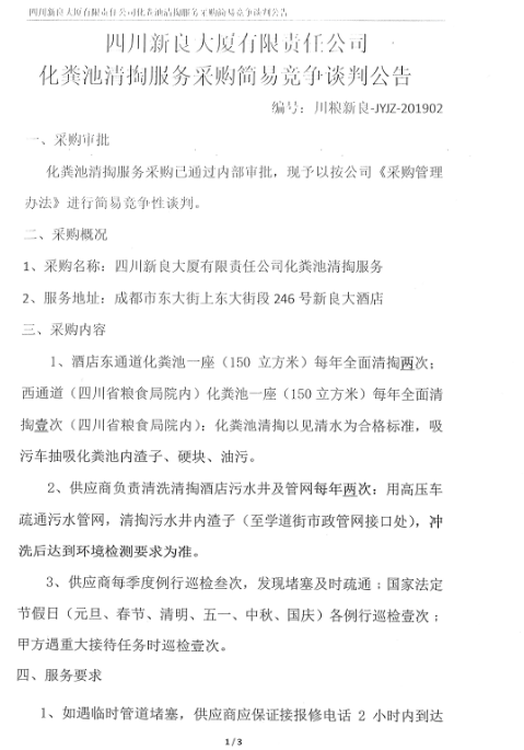 四川新良大厦有限责任公司化粪池清掏服务采购简易竞争谈判公告