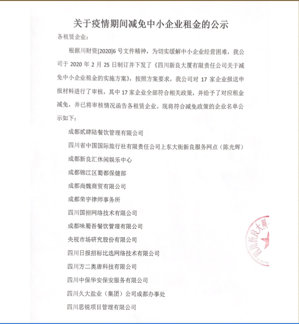 四川新良大厦有限责任公司关于疫情期间减免中小企业租金的公示
