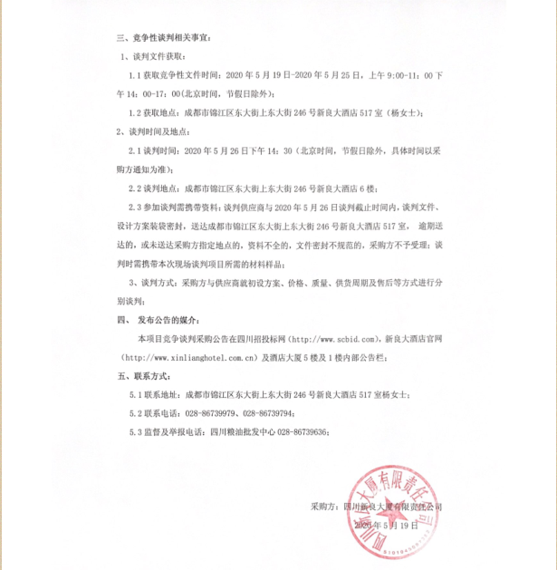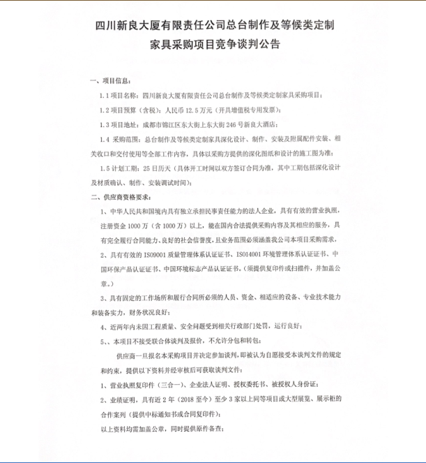 四川新良大厦有限责任公司总台制作及等候类定制家具采购项目竞争谈判公告