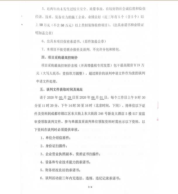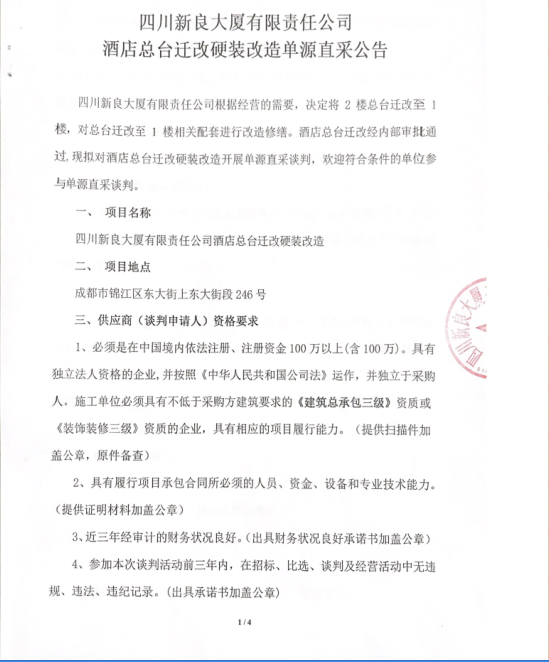 四川新良大厦有限责任公司酒店总台迁改硬装改造单源直采公告