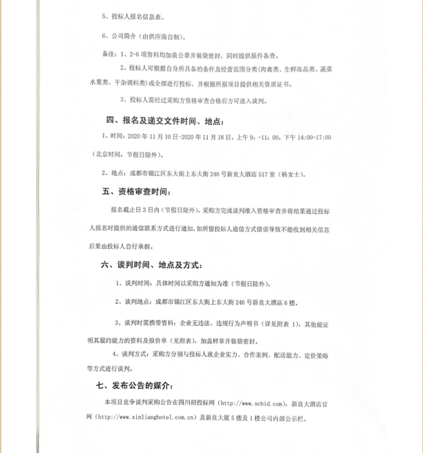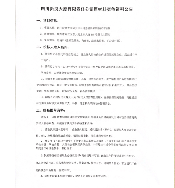 四川新良大厦有限责任公司原材料竞争谈判公告