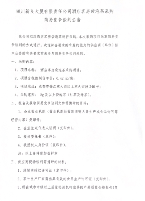 四川新良大厦有限责任公司酒店客房袋泡茶采购简易竞争谈判公告