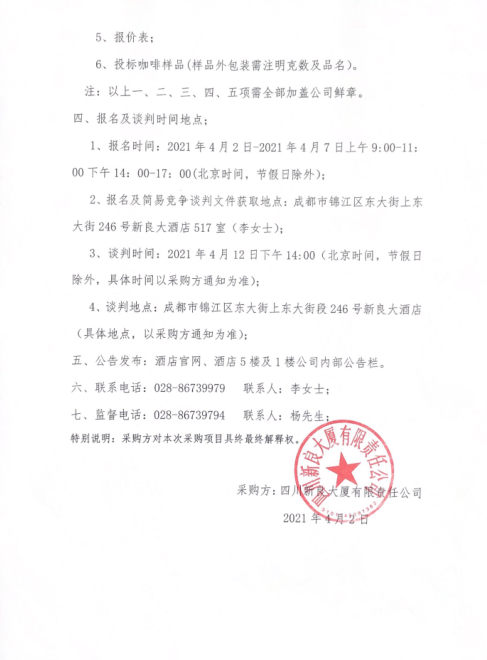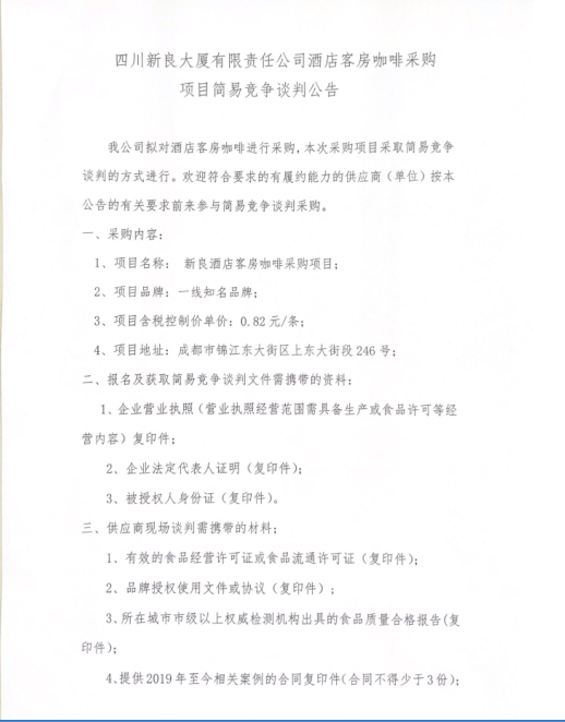 四川新良大厦有限责任公司酒店客房咖啡采购项目简易竞争谈判公告