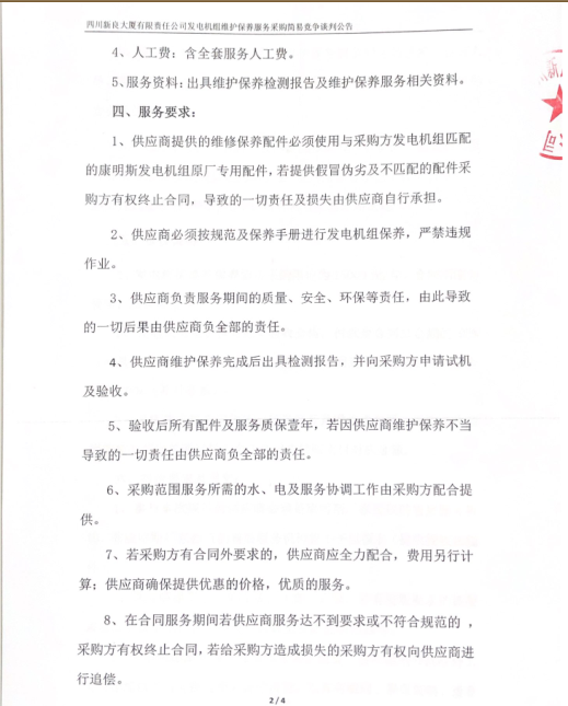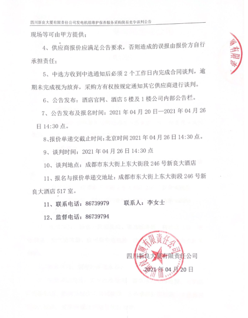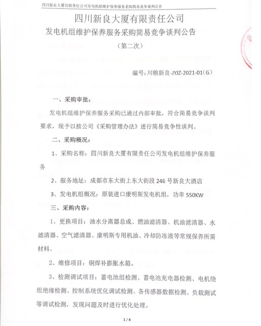 四川新良大厦有限责任公司发电机组维护保养服务采购简易竞争谈判公告(第二次)