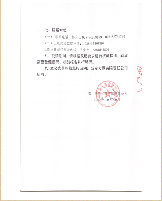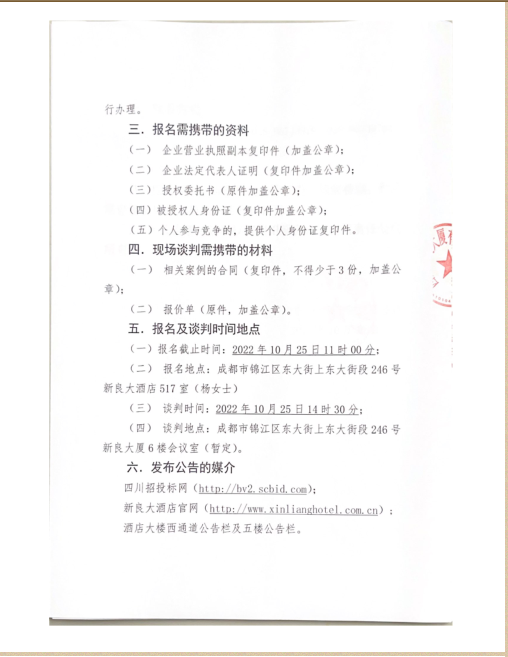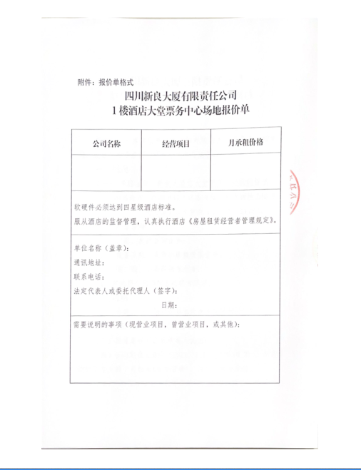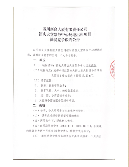 四川新良大厦有限责任公司酒店大堂票务中心出租项目简易竞争谈判公告