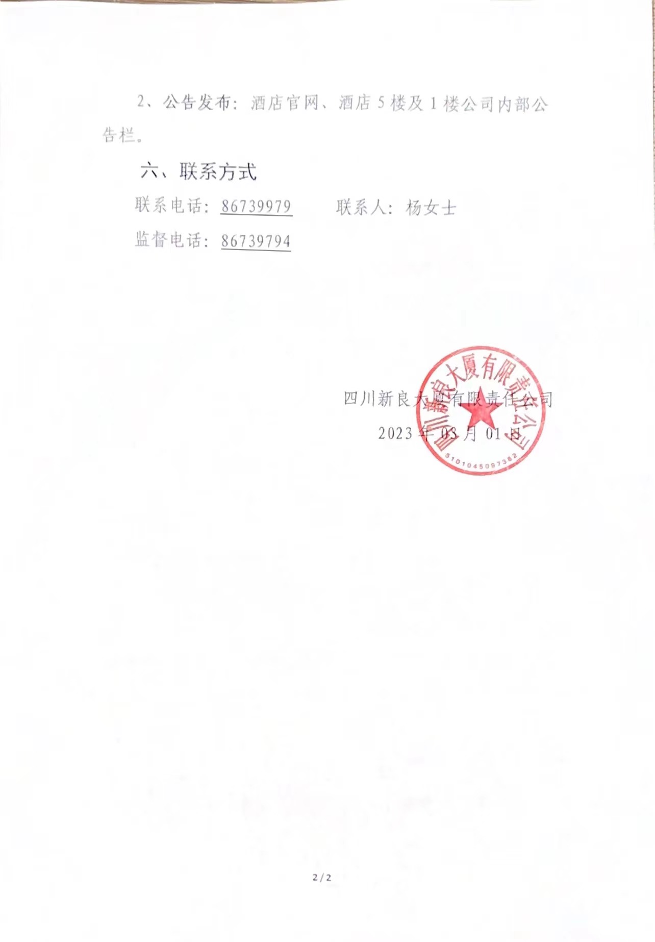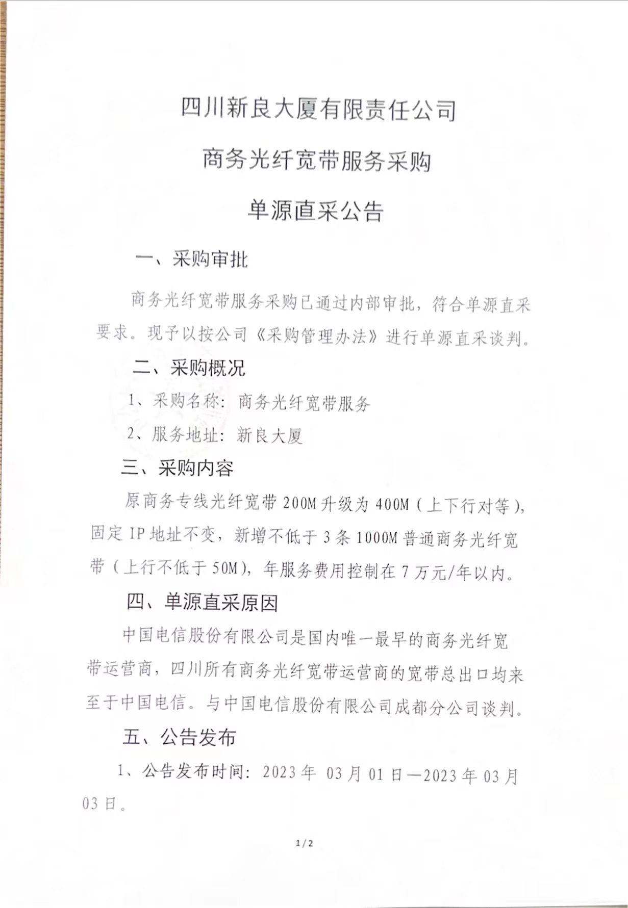 四川新良大厦有限责任公司商务光纤宽带服务采购单源直采公告