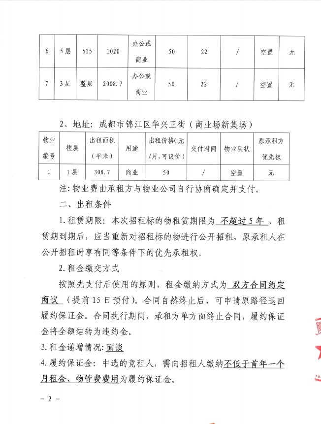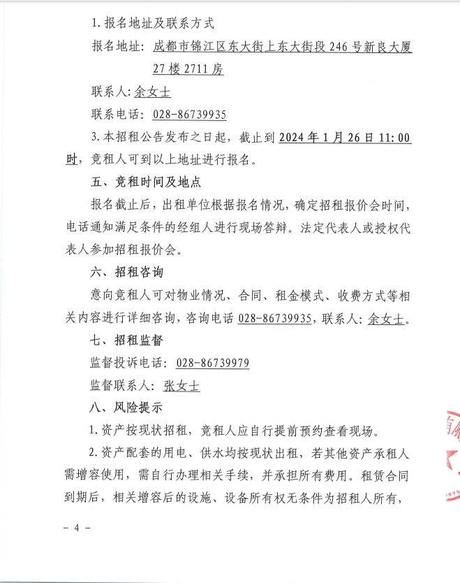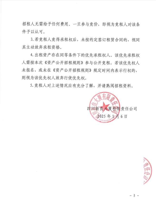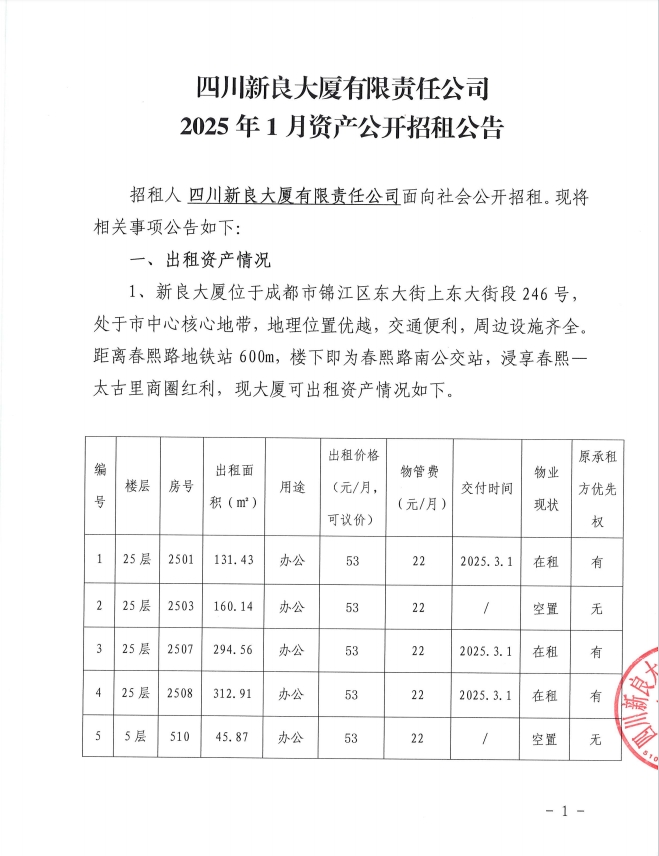 四川新良大厦有限责任公司2025年1月资产公开招租公告