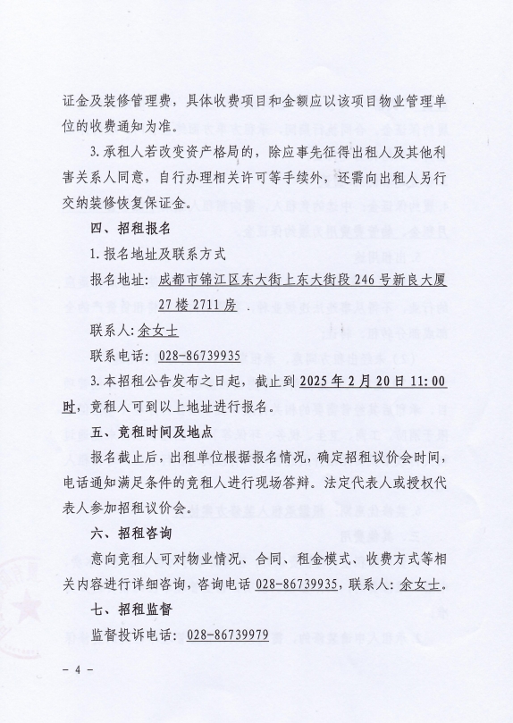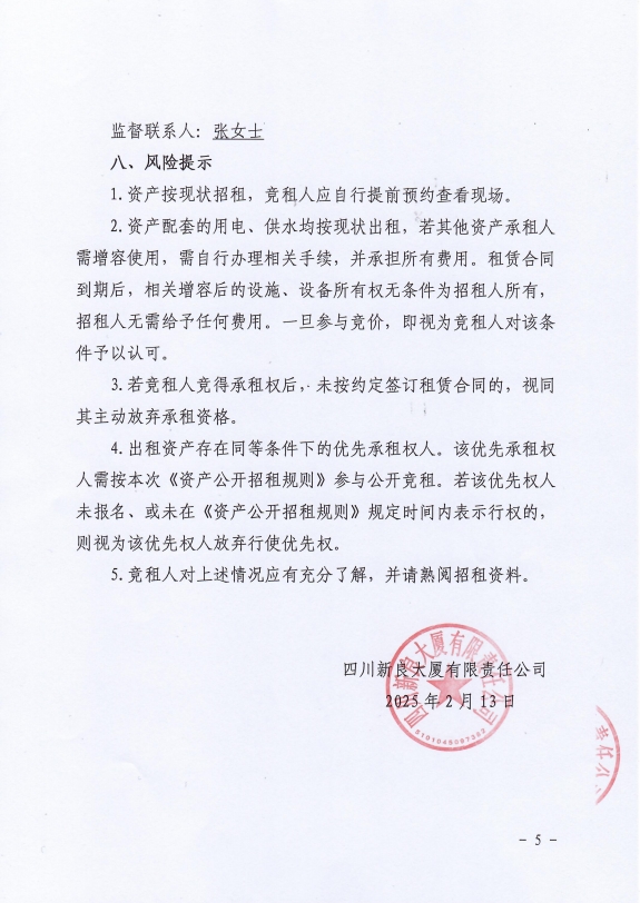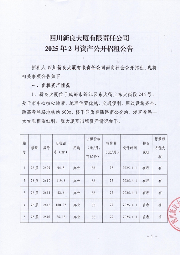 四川新良大厦有限责任公司2025年2月资产公开招租公告