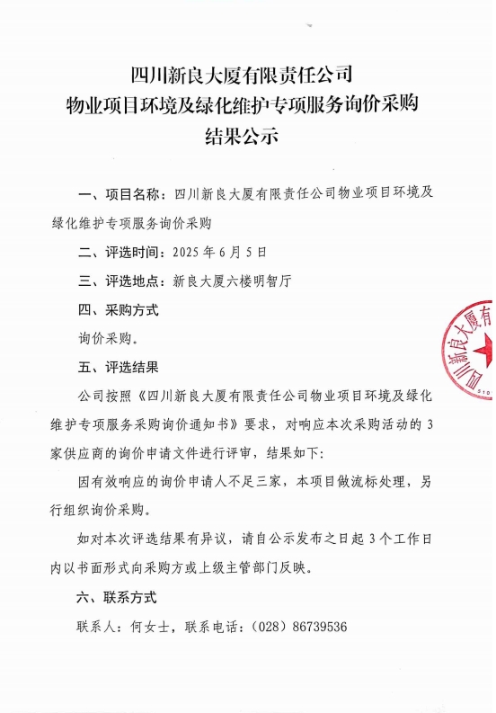 四川新良大厦有限责任公司物业项目环境及绿化维护专项服务询价采购结果公示