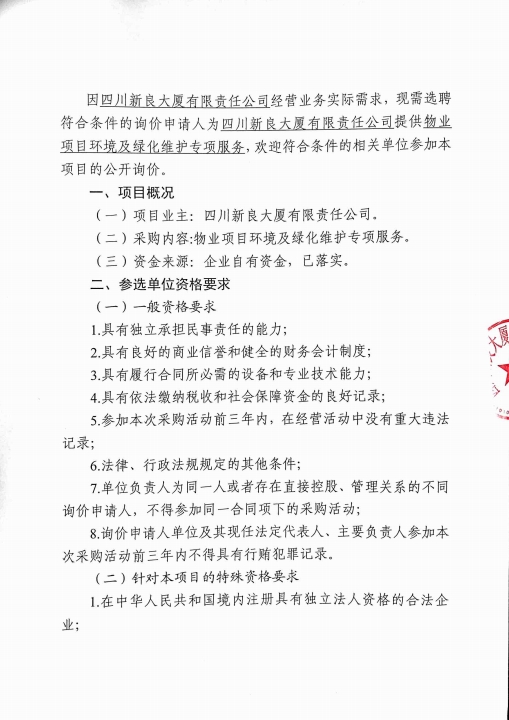 四川新良大厦有限责任公司物业项目环境及绿化维护专项服务询价采购公告(第二次)