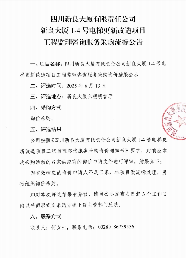 四川新良大厦有限责任公司新良大厦1-4号电梯更新改造项目工程监理咨询服务采购流标公告