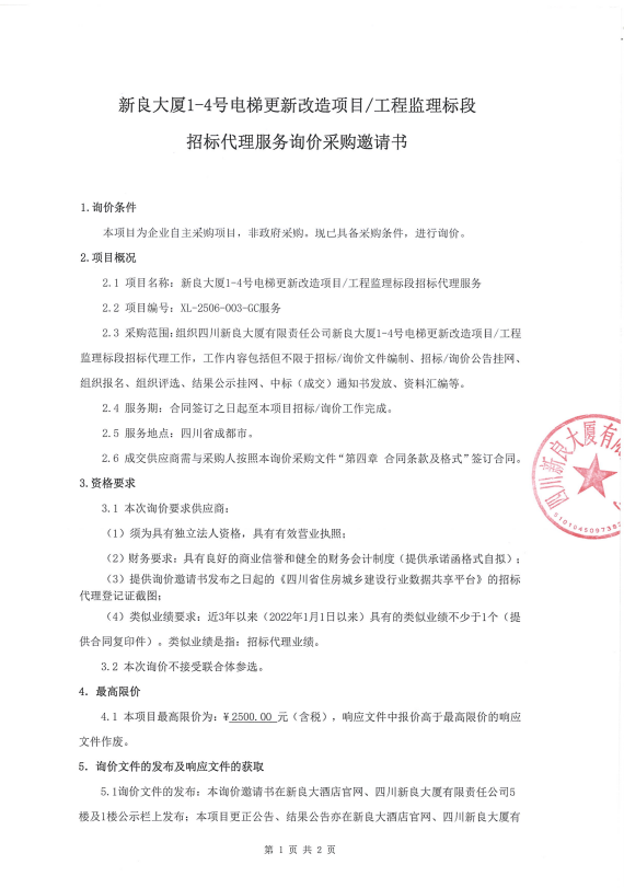 新良大厦1-4号电梯更新改造项目/工程监理标段招标代理服务询价采购邀请书