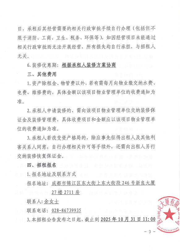 四川新良大厦有限责任公司2025年10月资产公开招租公告
