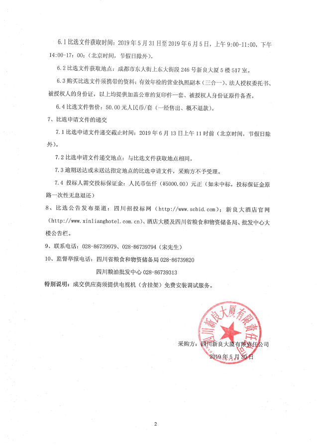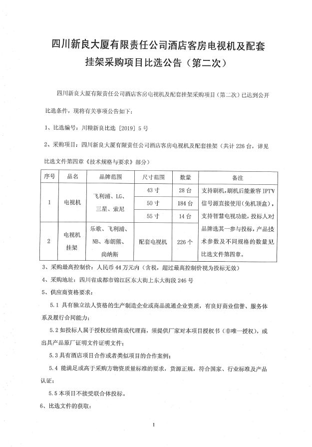 四川新良大厦有限责任公司酒店客房电视机及配套挂架采购项目必选公告(第二次)