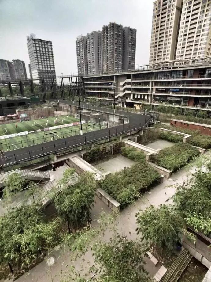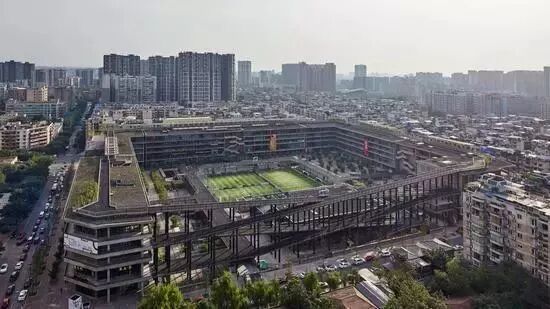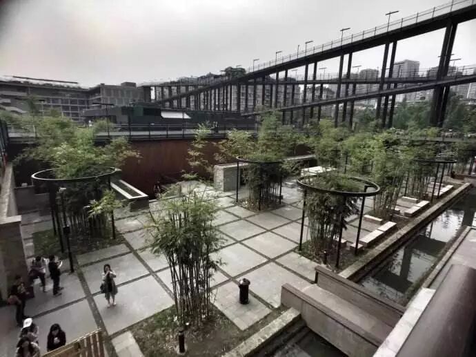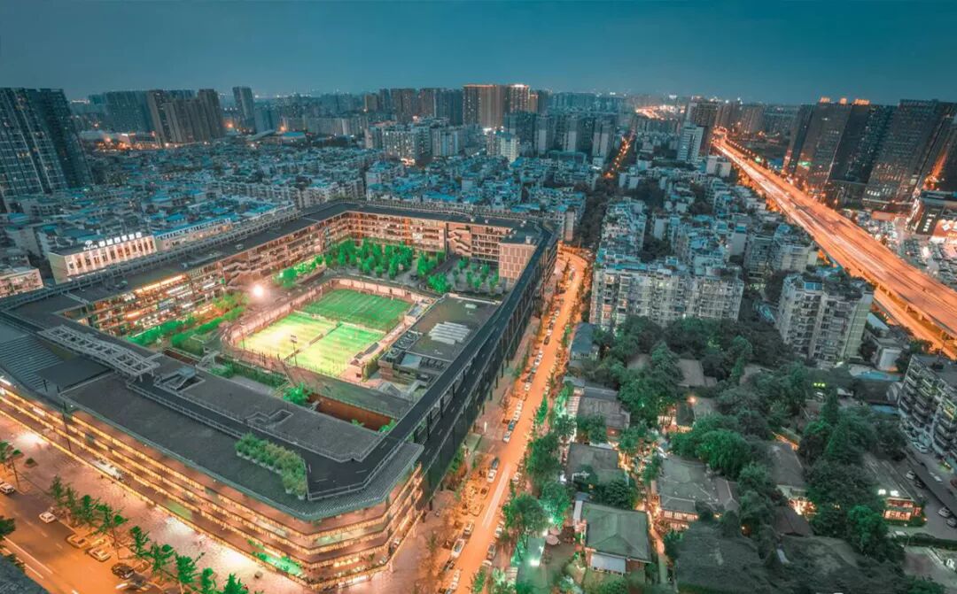 西村大院的设计一反中心体量集合的城市综合体常见模式,采用外环内空的布局,环绕街区沿边修建,围合出一个公园般的超大院落,成为一个外高内低,容纳纷繁杂陈的公共生活的“绿色盆地”,呼应了四川盆地的原风景。